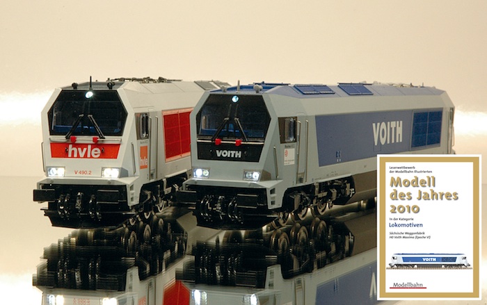 | 005. Skischleifer für Mittelleiterbetrieb Das Modell der Voith Maxima ist das erste Modell, welches trotz an vorbildgerechter Lage angebrachter Zug-Druckstange über einen Mittelschleifer für den Betrieb im 3L-Wechselstromsystem verfügt. Dazu wurde ein Skischleifer entwickelt, der im Schleiferbereich sowohl die elektrische (»Kontakt«) als auch mechanische Funktion (»Feder«) herstellt. Die klassische Bauweise mit einem festen Schleifer (dem eigentlichen »Skischleifer«) und separater, federnder Aufhängung scheidet bei den gegebenen Umständen (Tiefzuganlenkung mit Zug-Druckstange) aus. Bei der Entwicklung wurde ein späterer Schleiferaustausch (Verschleissteil) berücksichtigt: So lässt sich der Schleifer aus seinen beiden Halterungen herausziehen und nach Ablöten an der Hauptplatine des Modells austauschen. Getestete Betriebsumgebung